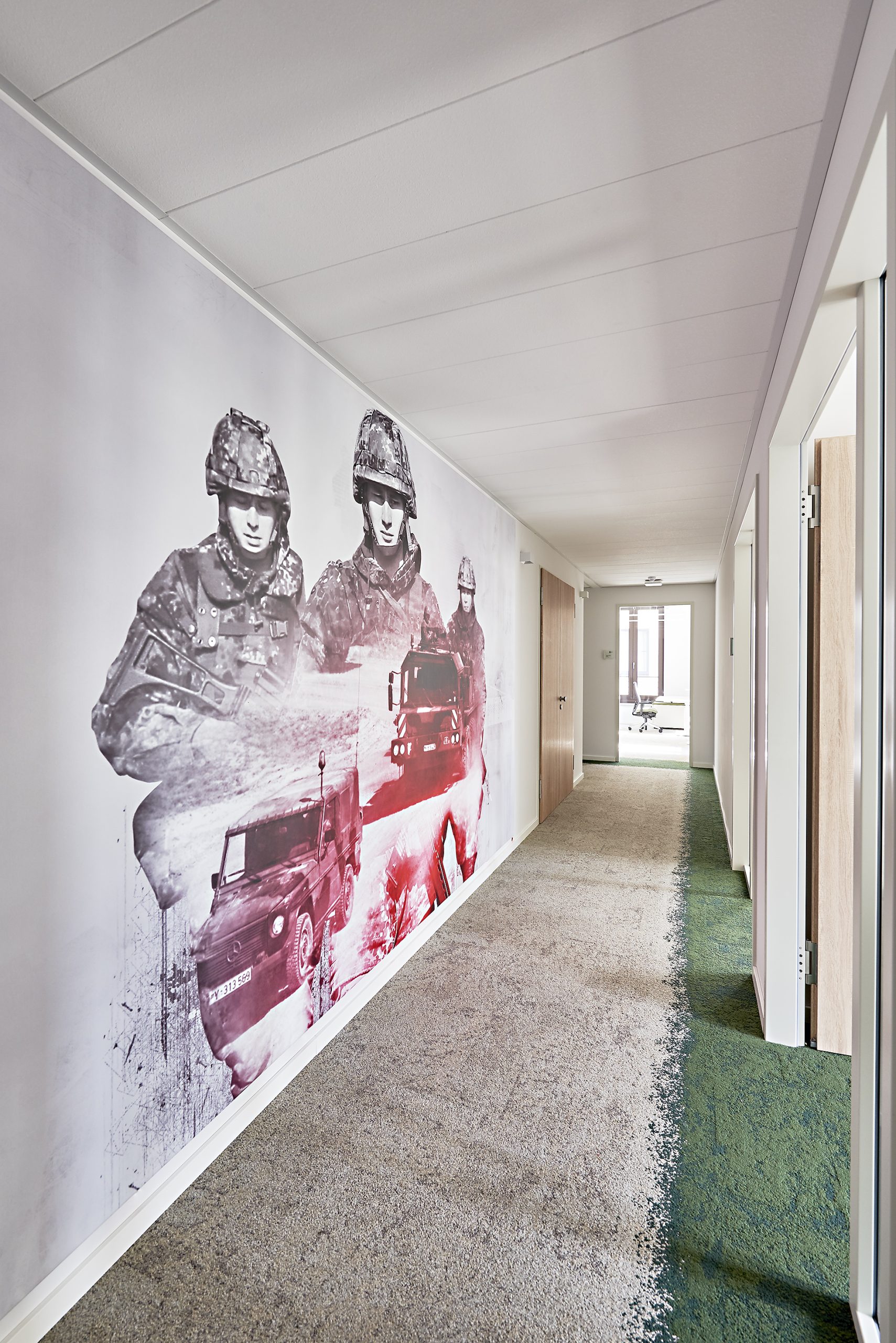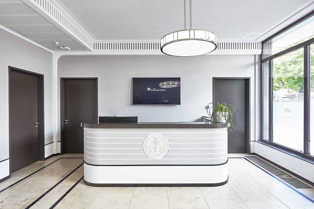 In der ersten Phase des Projektes erarbeiteten wir, auf Basis einer umfassenden Grundlagenermittlung zur Unternehmenskultur des Verbandes durch Interviews und Workshops, die Anforderungen an die neuen Arbeitswelten im DBwV. Die Ergebnisse der Workshops und Interviews stellten die Basis für das von uns zu erarbeitende Bürokonzept, die darauf basierenden konkreten Belegungsplanungen sowie das zu entwickelnde Farb- und Materialkonzept dar. Des Weiteren wirkten wir bei der Erarbeitung eines großformatigen Bildkonzeptes als verbindendes Designelement über alle Etagen mit.