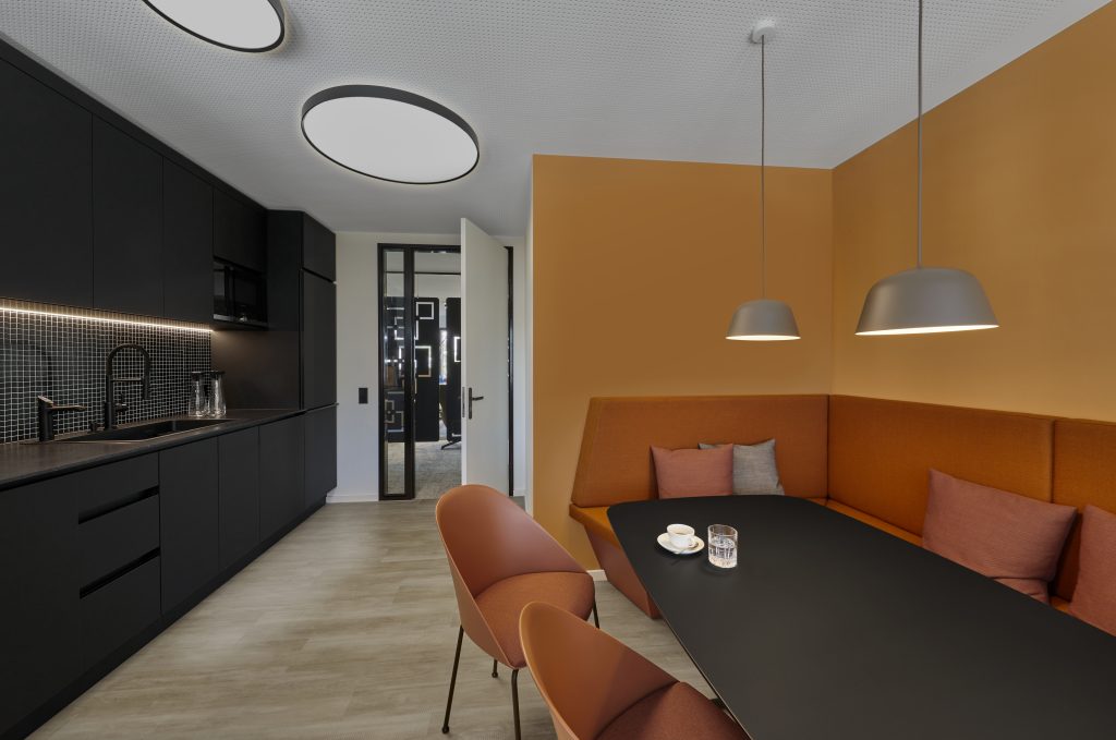 Offene Bereiche, geschützt durch individualisierte Akustikvorhänge sowie geschlossene Räume, zoniert durch Glastrennwände bieten ausreichend Raum für unterschiedlichste Arbeitsanforderungen und Meetingformate des Unternehmens. Vorhandenes Mobiliar wurde, durch Kombination mit neuen Elementen und innovativen Oberflächen, gelungen in das elegante Konzept integriert.