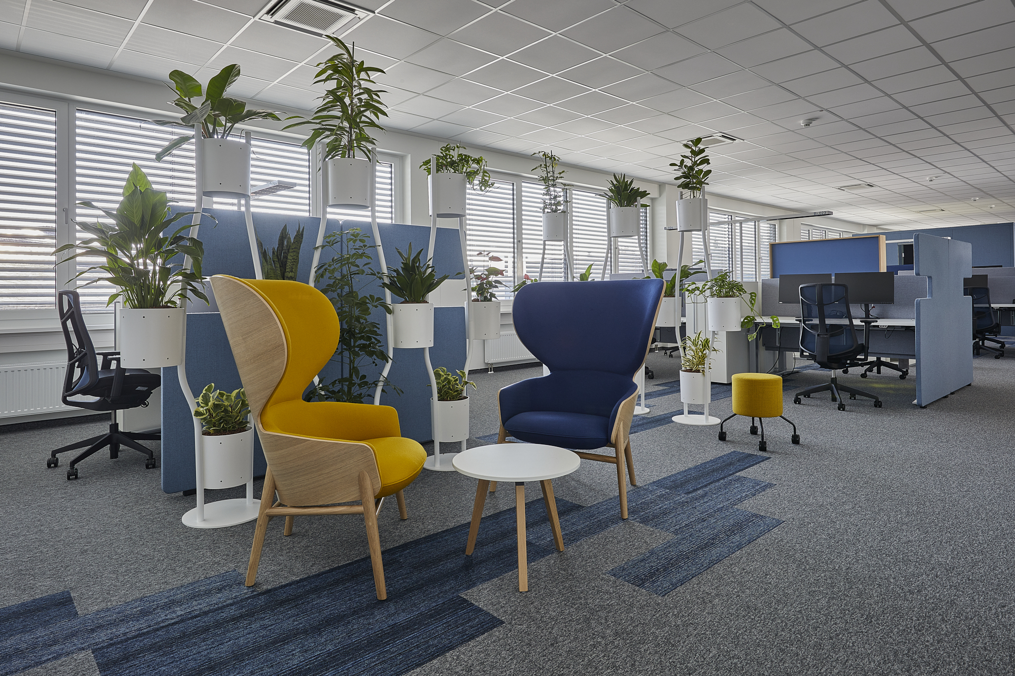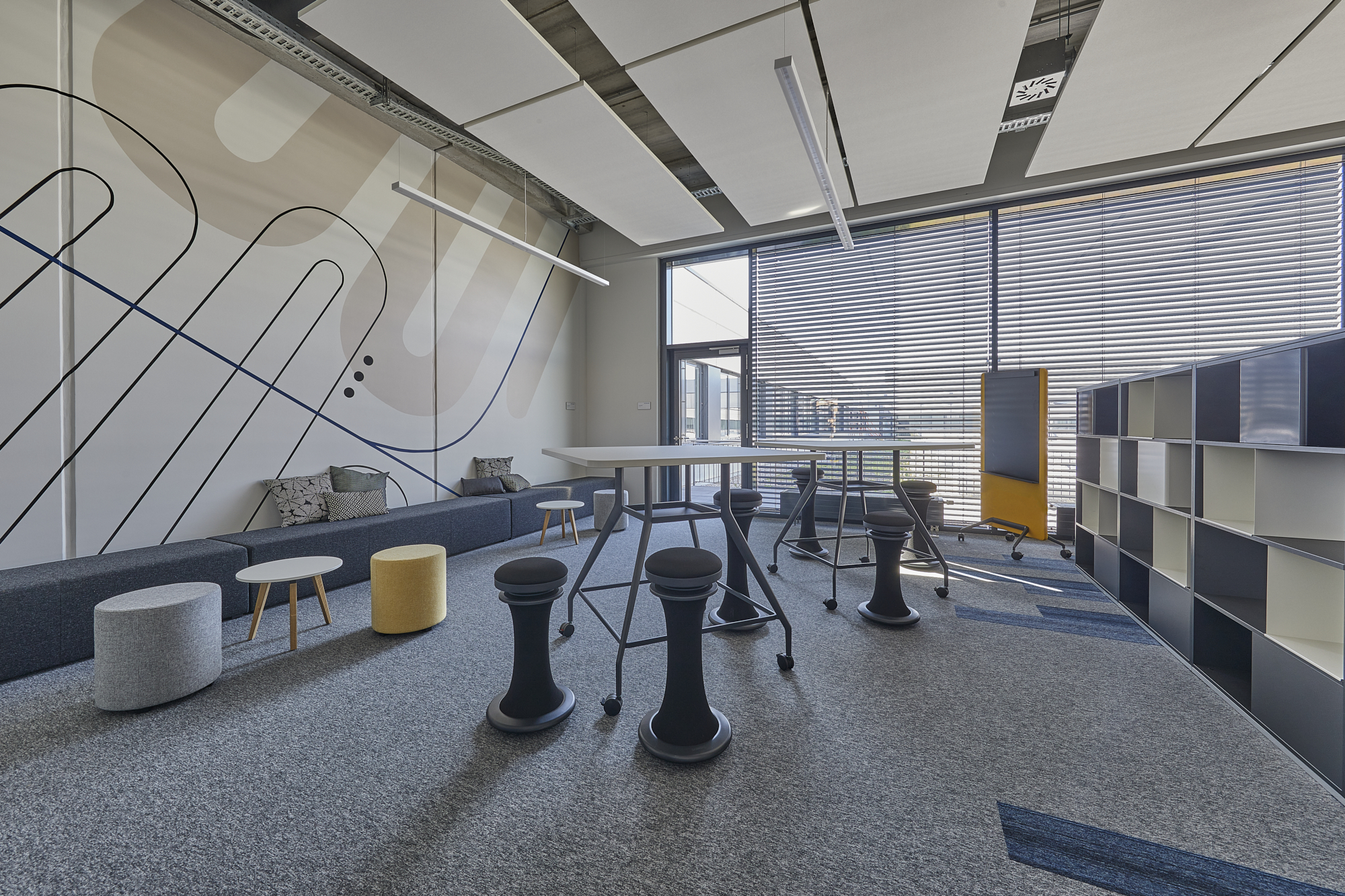 Die Auswahl verschiedenster Blautöne mit Akzenten in Gelb war die Voraussetzung bei der finalen Farb- und Materialkonzeption. Bei der Gestaltung der Arbeitsflächen wurde bewusst Wert auf eine Ausstattung gelegt, die sowohl Funktionalität, akustische Wirksamkeit als auch Wohlfühlcharakter integriert.