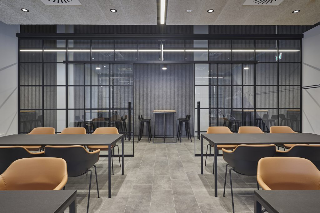 In der Kantine gibt es einen großzügigen Loungebereich mit Arena-Sitzpodest als Sonderbau.