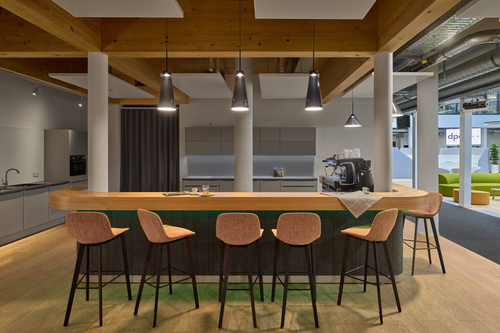 The rounded shapes in the design are naturally inspired by the dots in the dpa logo but also lend the rooms a natural and harmonious aesthetic. This is reflected in the central area of the atrium, but also, for example, in the design of the bar, which functions as a meeting point and communication hub, symbolizing the open and communicative corporate culture.