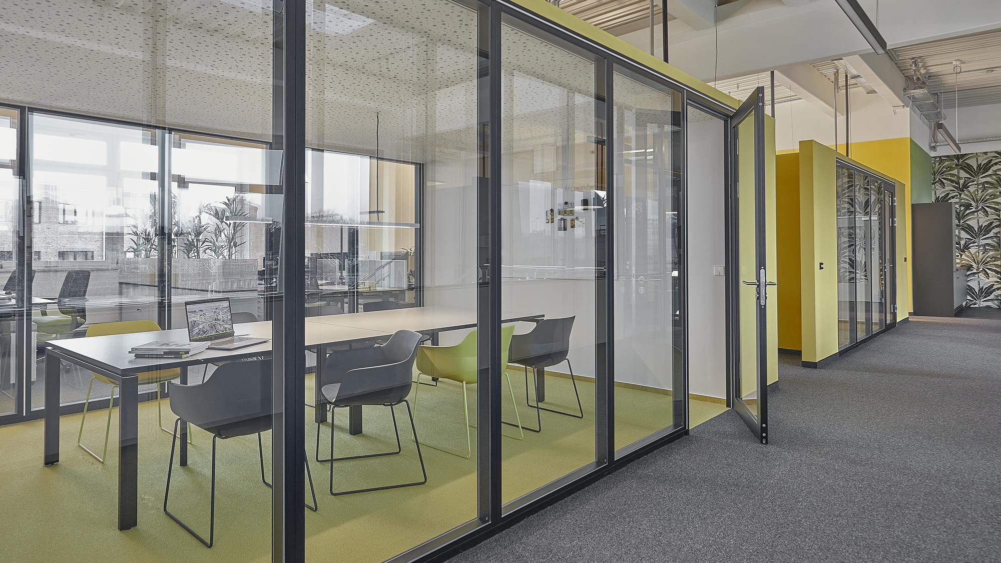 Especially the development of a comprehensive interior design concept was a lot of fun for us. A highlight is the striking yellow stripe, which is based on the company’s CD and runs three-dimensionally through the center of the space and serves as an acoustic filter. In the entrance lounge and conference kitchen, with their wooden surfaces and versatile green tones, the user is immersed in a naturally designed room atmosphere with a feel-good factor.