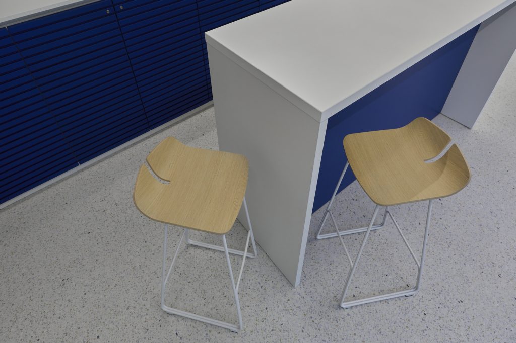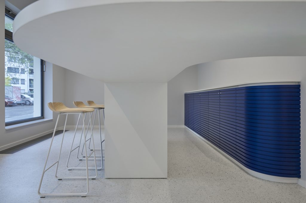 To emphasize our client’s brand identity, we chose square shapes and shades of blue as design features. These elements are reflected in the fabrics of the seating niches and chairs, among other areas. By combining them with real oak wood, we created a warm atmosphere. A special highlight of the furnishing concept is the 3D panel cabinet surfaces. Not only do they represent a unique design feature, but they also offer thermal and acoustic benefits. We implemented our client’s logo in a three-dimensional manner on the counter. A large “V” adorns the counter, clearly visible already in the entrance area.