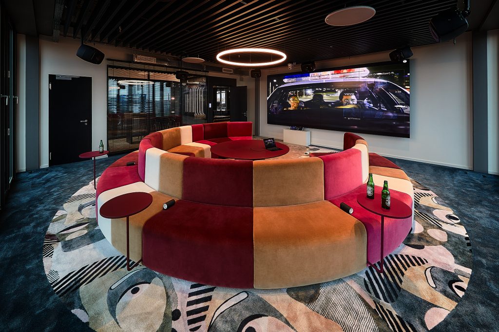 Ein Beispiel ist Warner Music. Dort haben wir unter anderem ein rundes Sofa mit samtigem Stoff entworfen, das für eine wohnliche Atmosphäre sorgt. Ergänzt wurde es durch eine Cocktailbar und eine kleine Bühne für interne Veranstaltungen. Zudem kamen Teppichböden zum Einsatz, die nicht nur die Akustik verbessern, sondern auch das Gefühl von Gemütlichkeit verstärken.