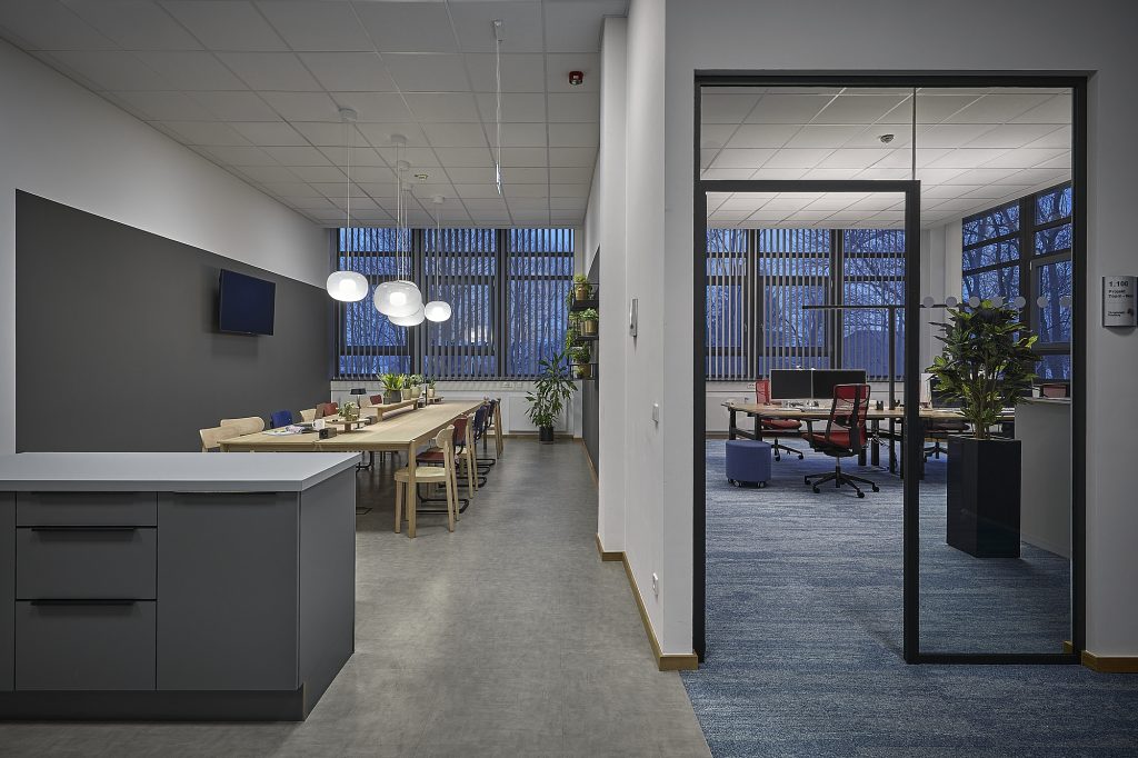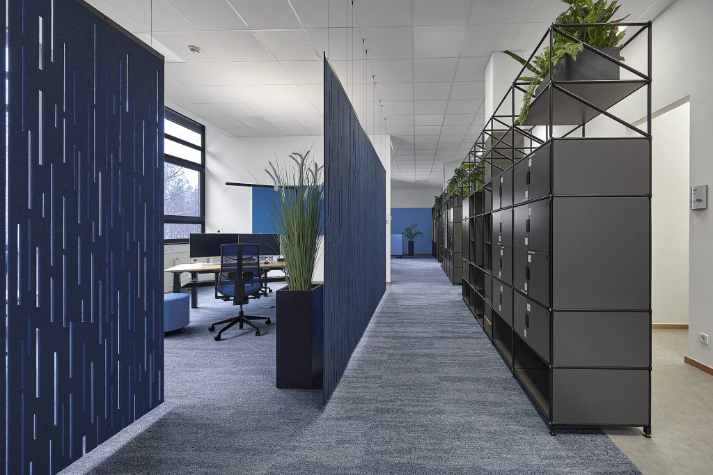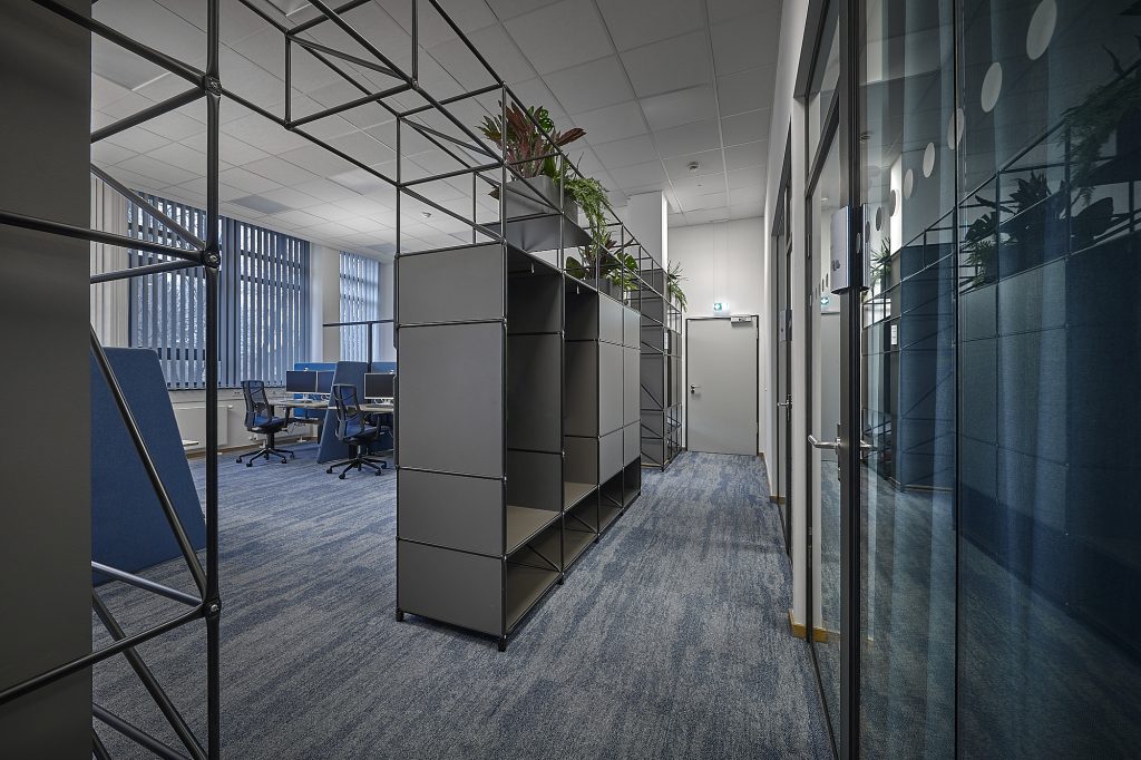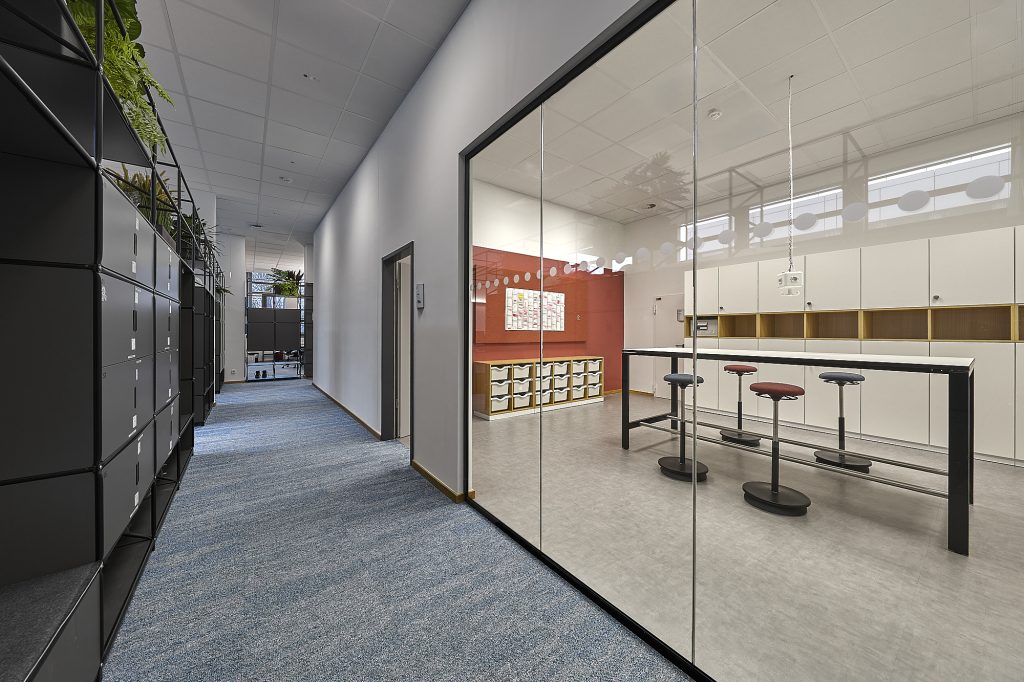 Bereits beim Betreten des Modulgebäudes spürt man den Gedanken hinter dem Konzept. Die äußeren Bereiche des Büros sind offen gestaltet, bewusst dynamisch, und laden zu spontanen Begegnungen, Diskussionen und kurzen Abstimmungen ein. Akustisch und optisch wirken sie lebendig – „laut“ im besten Sinne. Hier dominieren flexible Möblierungen, offene Kommunikationsflächen und ein hoher Grad an Sichtbeziehungen, der Transparenz und Teilhabe signalisiert.